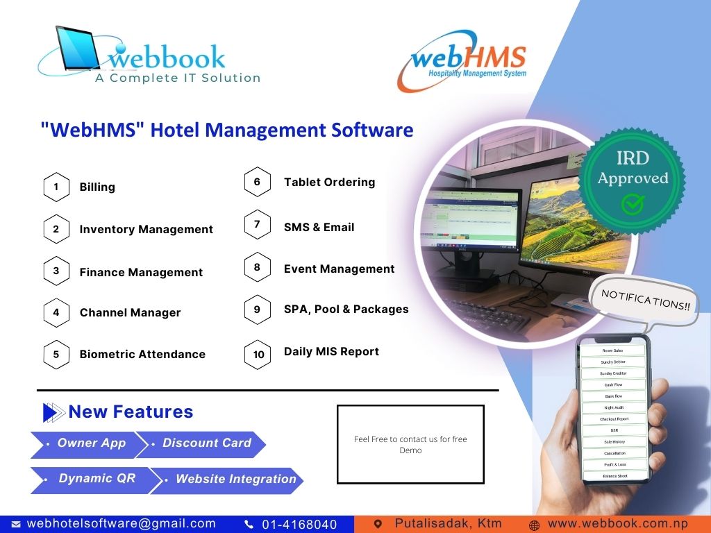 Unbeatable Features at Unbelievable Price. Totally International Standard. Just Install in single computer and No need to install anything in any device. Software includes features required for smooth operation of your hospitality industry in terms of Nepal Context.
